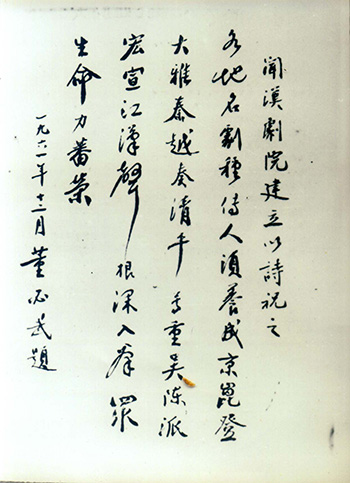 武漢漢劇院是全國(guó)有較大影響的藝術(shù)團(tuán)體,其前身為武漢漢劇團(tuán)。一九六二年在周恩來(lái)總理的關(guān)懷下,正式建院,國(guó)家副主席董必武贈(zèng)詩(shī):“京昆登大雅、秦越奏清平,尊重吳陳派,宏宣江漢聲,根深如群眾,生命力蕃榮”以示祝賀。